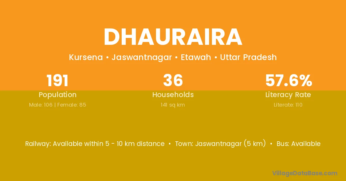 Jaswantnagar (5 km) is the nearest town to Dhauraira village for major economic activities and is located approximately 5 km away.