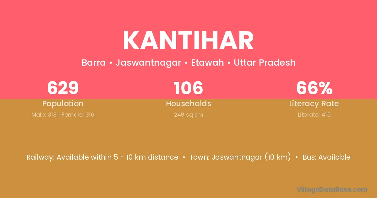 Jaswantnagar (10 km) is the nearest town to Kantihar village for major economic activities and is located approximately 10 km away.