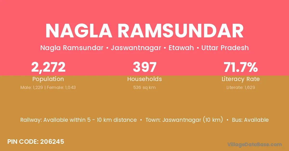 Jaswantnagar (10 km) is the nearest town to Nagla Ramsundar village for major economic activities and is located approximately 10 km away.