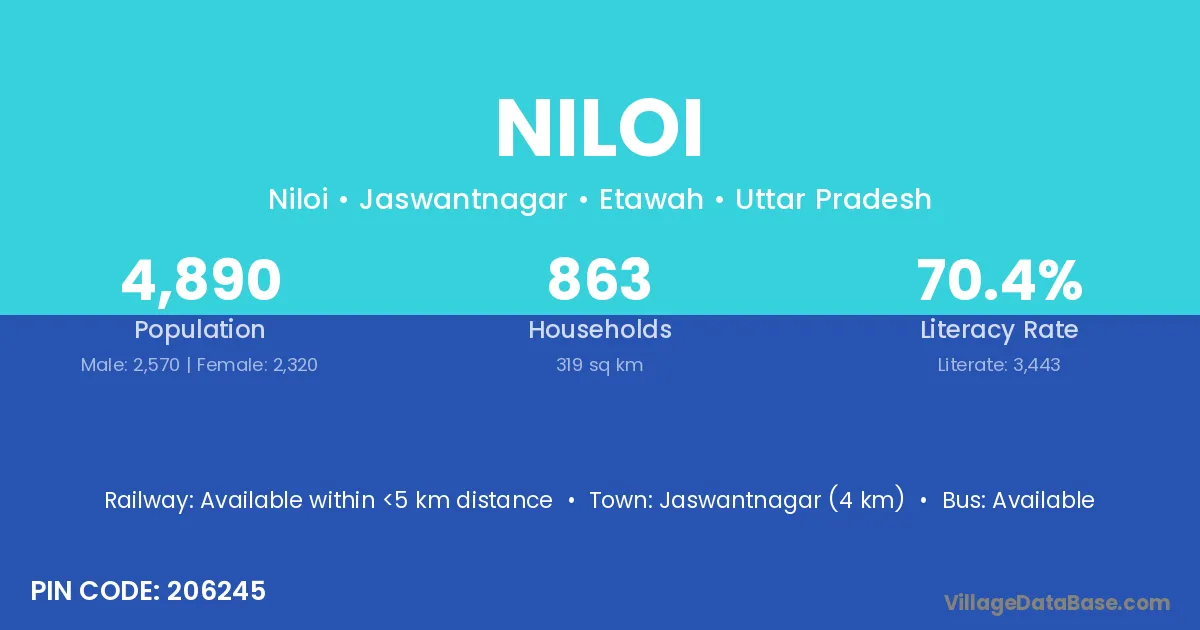 Jaswantnagar (4 km) is the nearest town to Niloi village for major economic activities and is located approximately 4 km away.