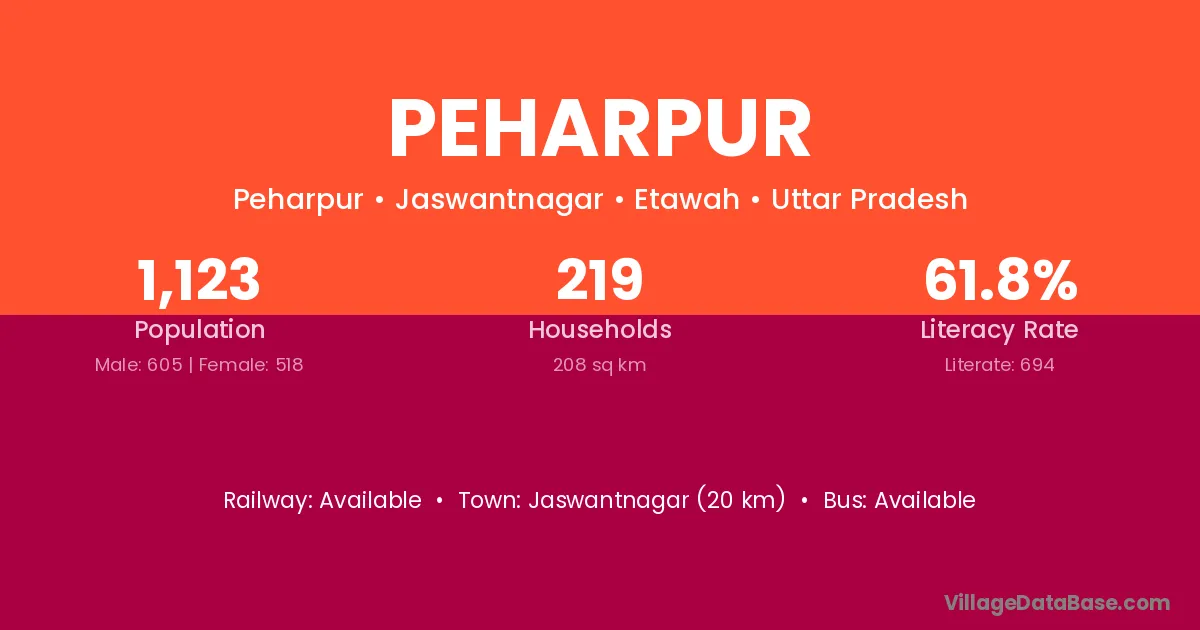 Jaswantnagar (20 km) is the nearest town to Peharpur village for major economic activities and is located approximately 20 km away.