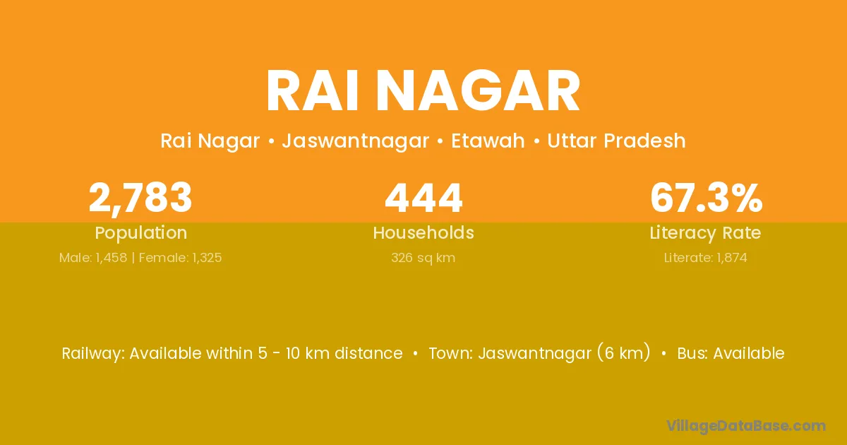 Jaswantnagar (6 km) is the nearest town to Rai Nagar village for major economic activities and is located approximately 6 km away.