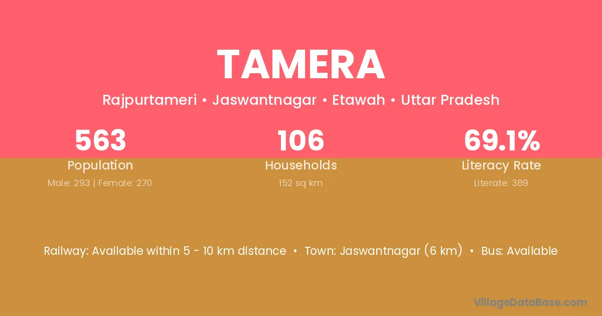 Jaswantnagar (6 km) is the nearest town to Tamera village for major economic activities and is located approximately 6 km away.