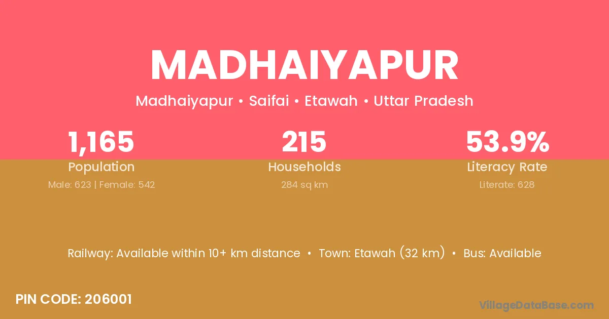 Etawah (32 km) is the nearest town to Madhaiyapur village for major economic activities and is located approximately 32 km away.