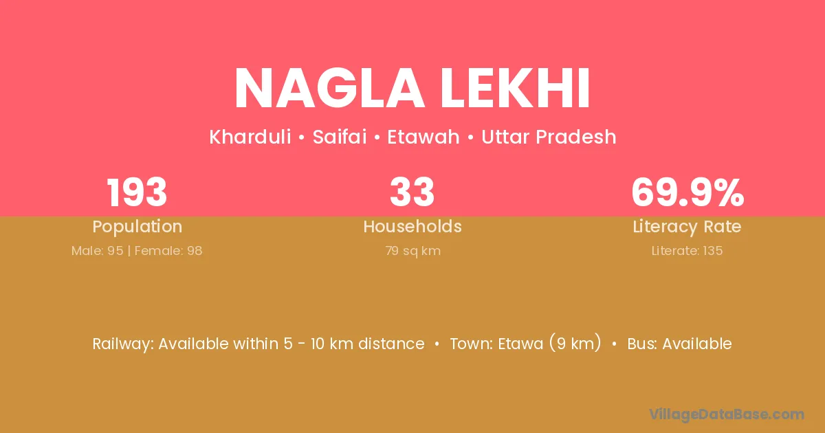 Etawa (9 km) is the nearest town to Nagla Lekhi village for major economic activities and is located approximately 9 km away.