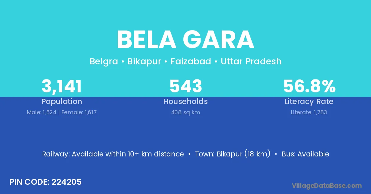 Bikapur (18 km) is the nearest town to Bela Gara village for major economic activities and is located approximately 18 km away.