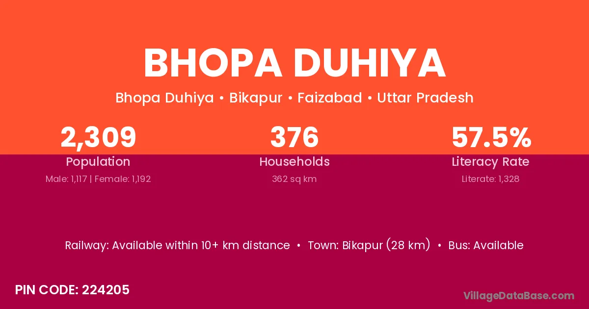 Bikapur (28 km) is the nearest town to Bhopa Duhiya village for major economic activities and is located approximately 28 km away.
