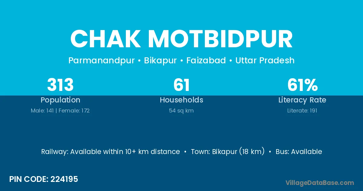 Bikapur (18 km) is the nearest town to Chak Motbidpur village for major economic activities and is located approximately 18 km away.