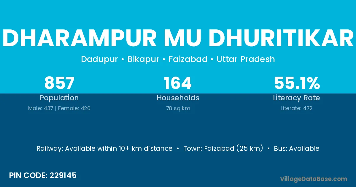 Faizabad (25 km) is the nearest town to Dharampur Mu Dhuritikar village for major economic activities and is located approximately 25 km away.