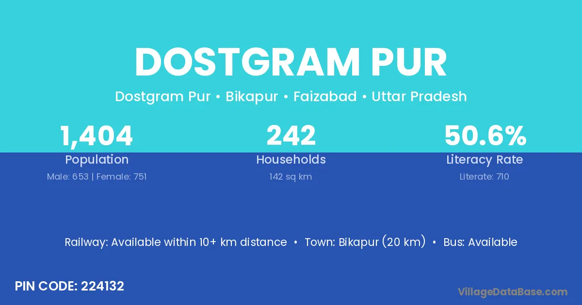 Bikapur (20 km) is the nearest town to Dostgram Pur village for major economic activities and is located approximately 20 km away.