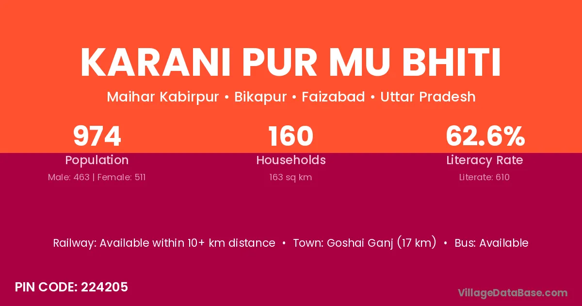 Karani Pur Mu Bhiti village has a total population of 974 people, of which 463 are males and 511 are females.