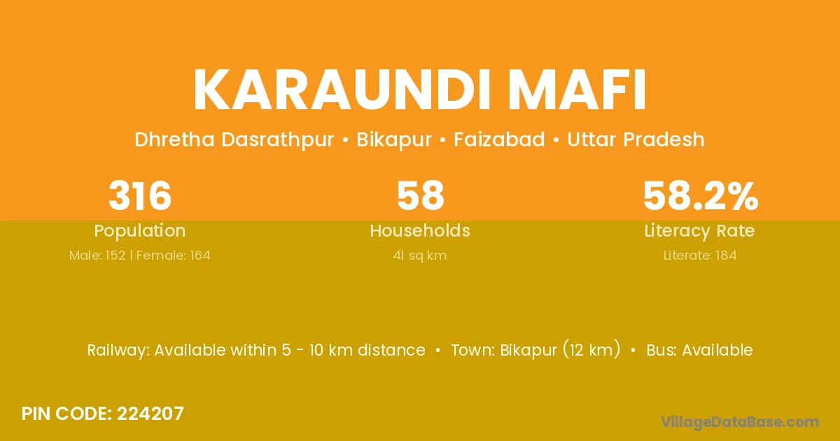 Bikapur (12 km) is the nearest town to Karaundi Mafi village for major economic activities and is located approximately 12 km away.
