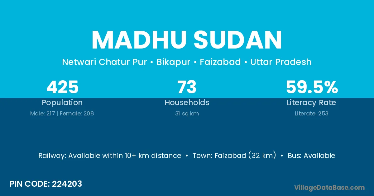Faizabad (32 km) is the nearest town to Madhu Sudan village for major economic activities and is located approximately 32 km away.