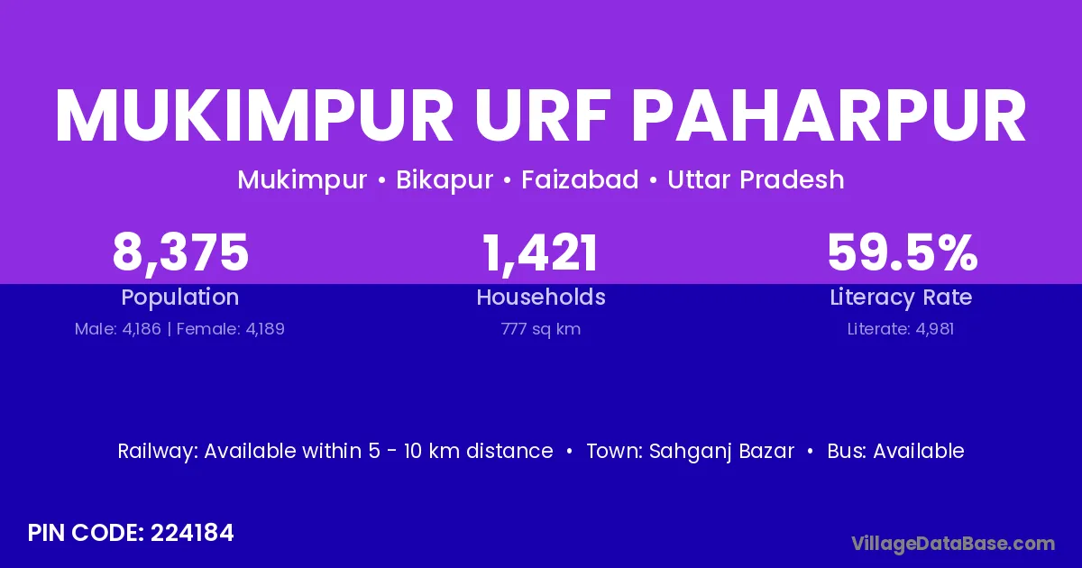 Mukimpur Urf Paharpur village has a total population of 8,375 people, of which 4,186 are males and 4,189 are females.
