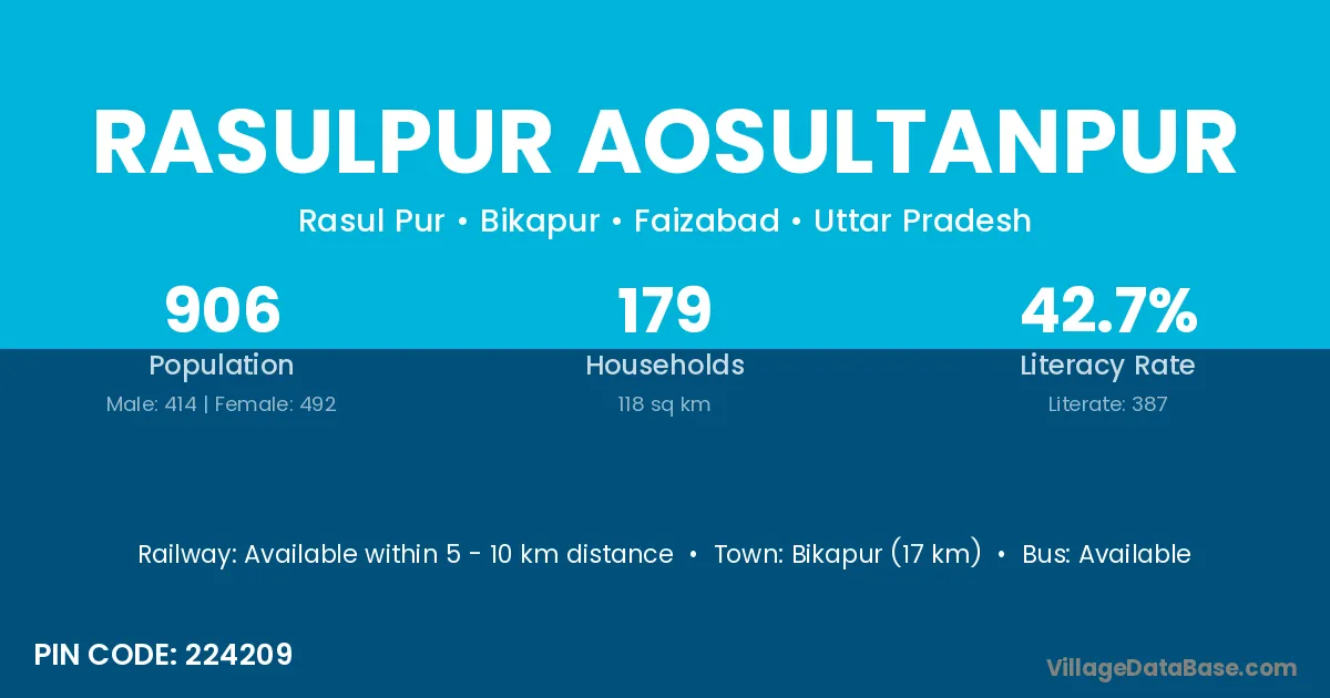 Bikapur (17 km) is the nearest town to Rasulpur Aosultanpur village for major economic activities and is located approximately 17 km away.