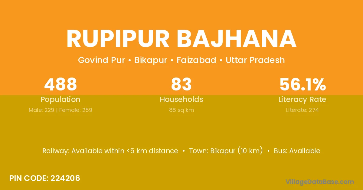 Bikapur (10 km) is the nearest town to Rupipur Bajhana village for major economic activities and is located approximately 10 km away.