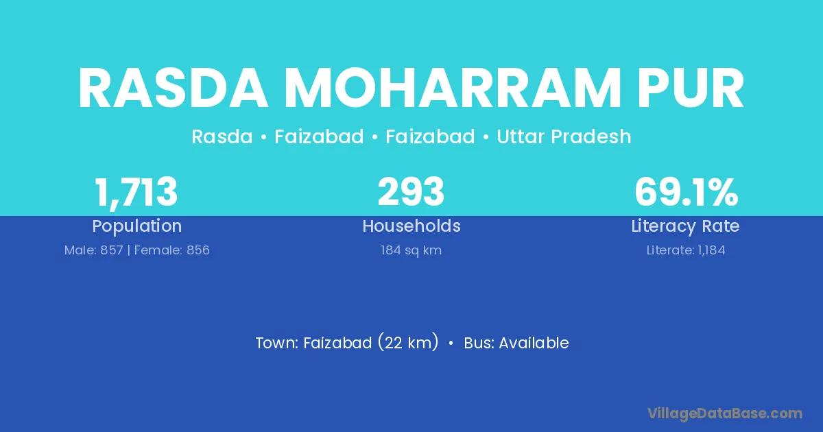 Faizabad (22 km) is the nearest town to Rasda Moharram Pur village for major economic activities and is located approximately 22 km away.
