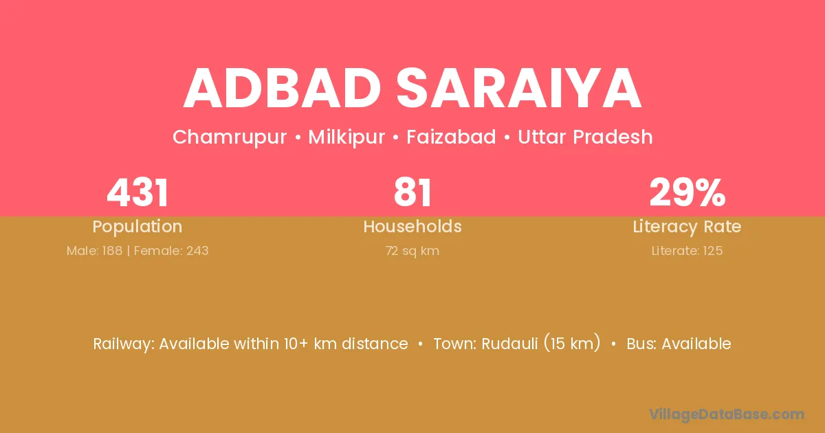 Adbad Saraiya village has a total population of 431 people, of which 188 are males and 243 are females.