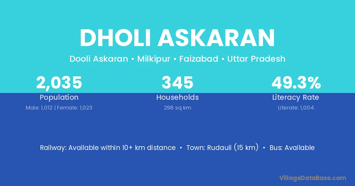 Rudauli (15 km) is the nearest town to Dholi Askaran village for major economic activities and is located approximately 15 km away.
