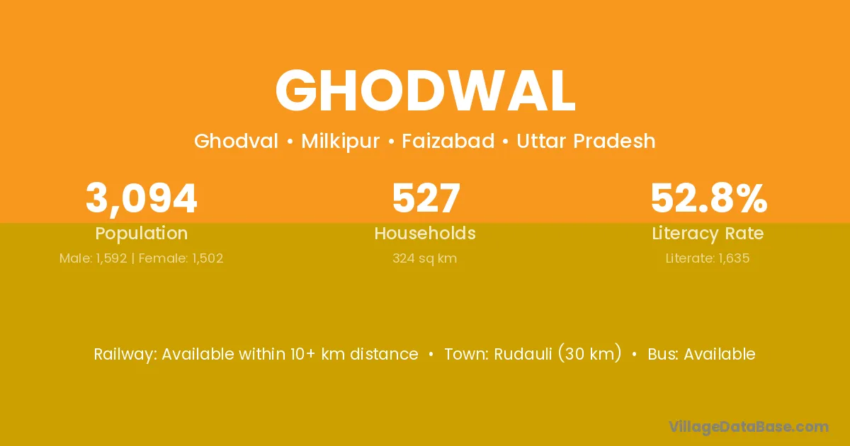 Rudauli (30 km) is the nearest town to Ghodwal village for major economic activities and is located approximately 30 km away.