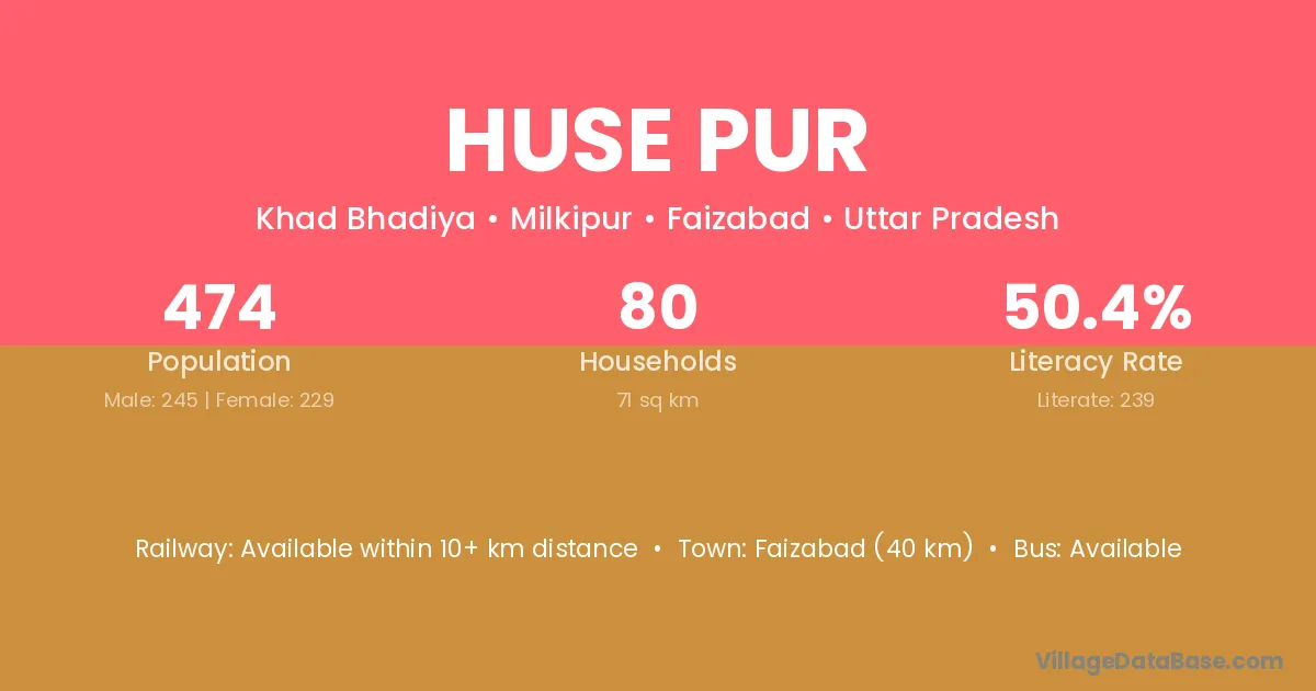 Faizabad (40 km) is the nearest town to Huse Pur village for major economic activities and is located approximately 40 km away.