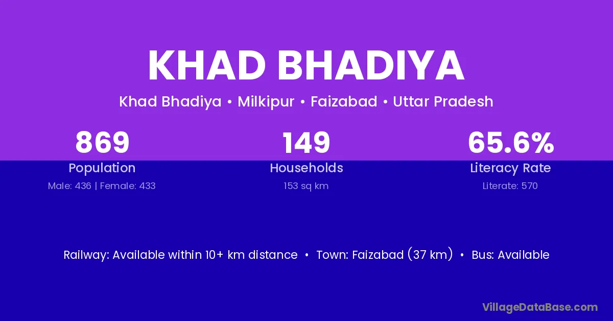 Faizabad (37 km) is the nearest town to Khad Bhadiya village for major economic activities and is located approximately 37 km away.