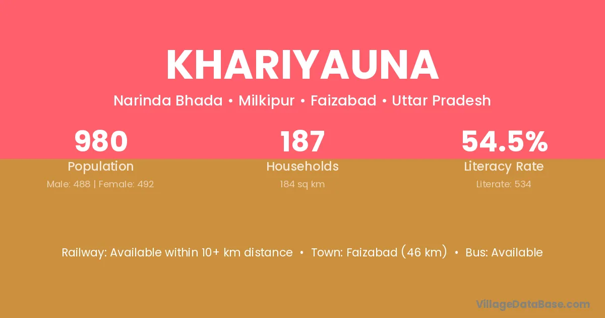 Faizabad (46 km) is the nearest town to Khariyauna village for major economic activities and is located approximately 46 km away.