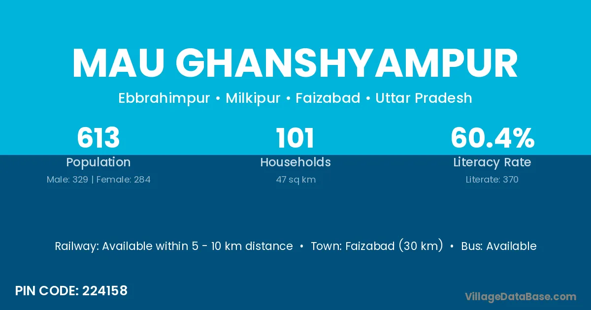 Faizabad (30 km) is the nearest town to Mau Ghanshyampur village for major economic activities and is located approximately 30 km away.