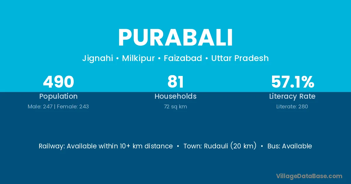 Rudauli (20 km) is the nearest town to Purabali village for major economic activities and is located approximately 20 km away.