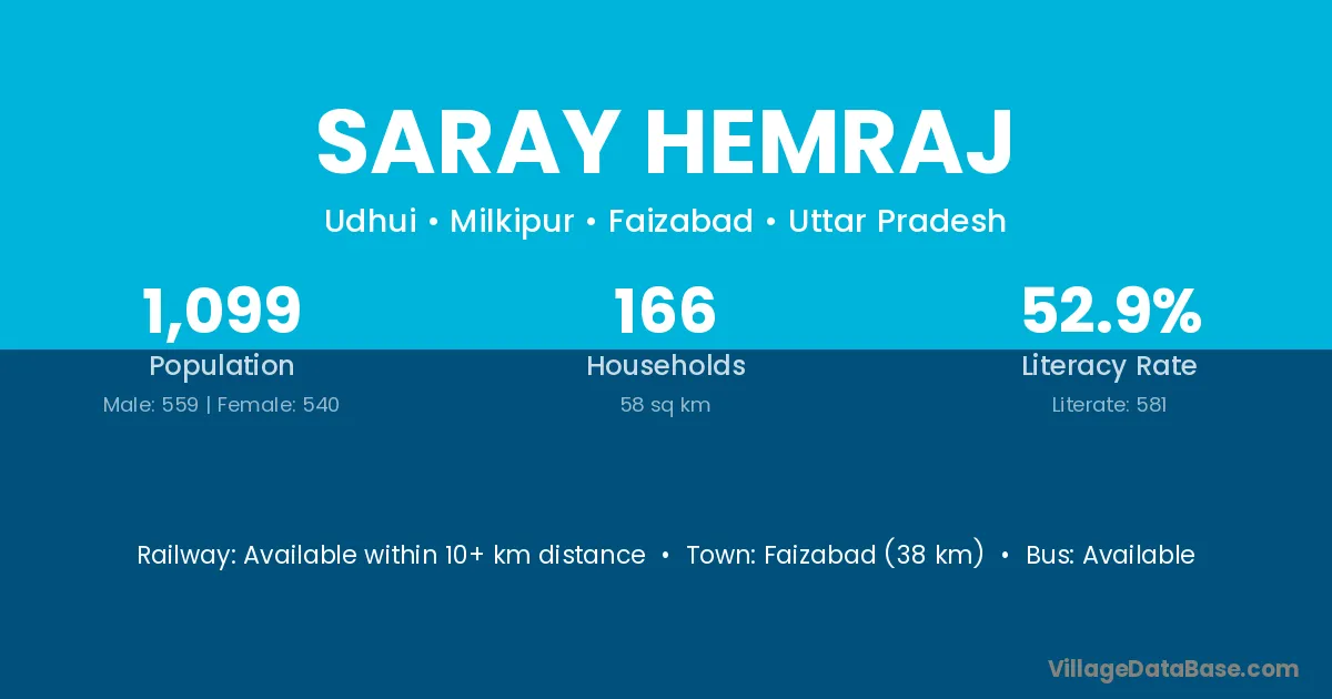 Faizabad (38 km) is the nearest town to Saray Hemraj village for major economic activities and is located approximately 38 km away.
