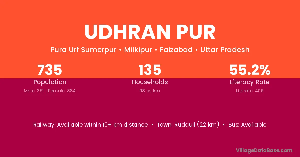 Rudauli (22 km) is the nearest town to Udhran Pur village for major economic activities and is located approximately 22 km away.