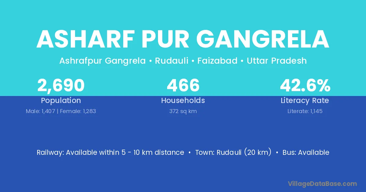 Rudauli (20 km) is the nearest town to Asharf Pur Gangrela village for major economic activities and is located approximately 20 km away.