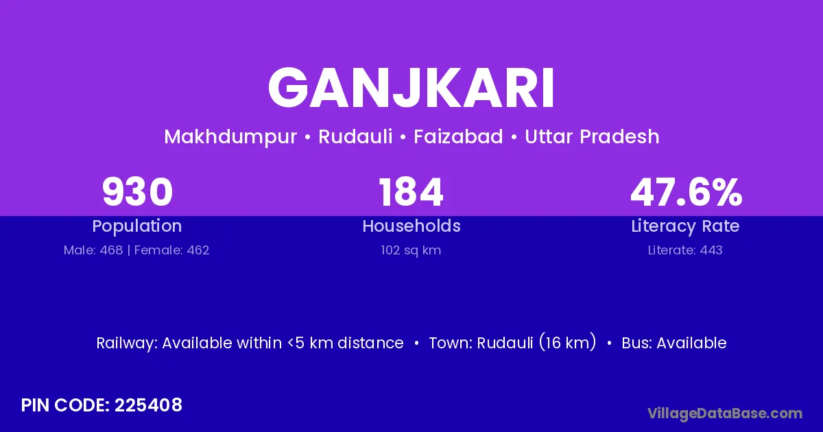 Rudauli (16 km) is the nearest town to Ganjkari village for major economic activities and is located approximately 16 km away.