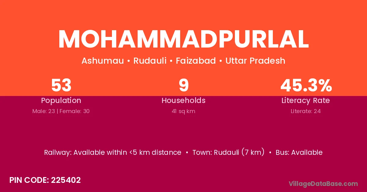 Mohammadpurlal village has a total population of 53 people, of which 23 are males and 30 are females.