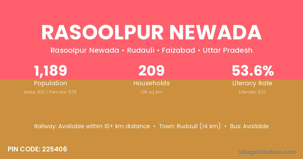 Rudauli (14 km) is the nearest town to Rasoolpur Newada village for major economic activities and is located approximately 14 km away.