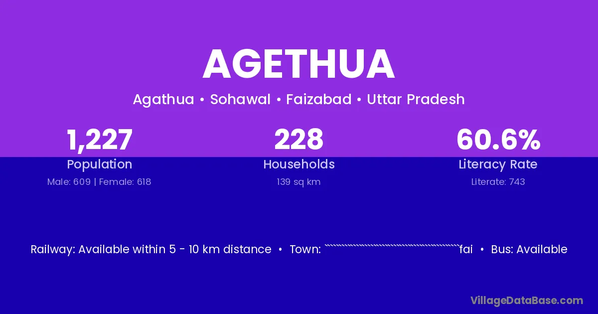 Agethua village has a total population of 1,227 people, of which 609 are males and 618 are females.