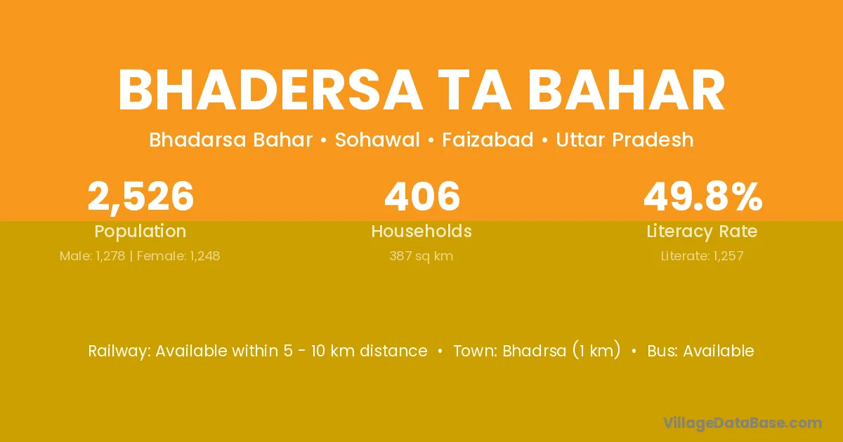 Bhadersa Ta Bahar village has a total population of 2,526 people, of which 1,278 are males and 1,248 are females.