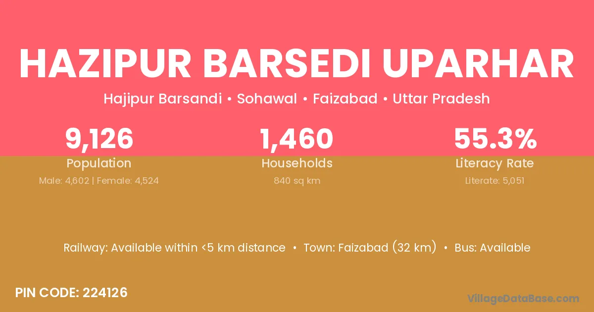 Faizabad (32 km) is the nearest town to Hazipur Barsedi Uparhar village for major economic activities and is located approximately 32 km away.