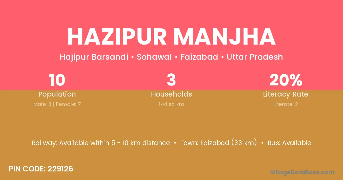Faizabad (33 km) is the nearest town to Hazipur Manjha village for major economic activities and is located approximately 33 km away.