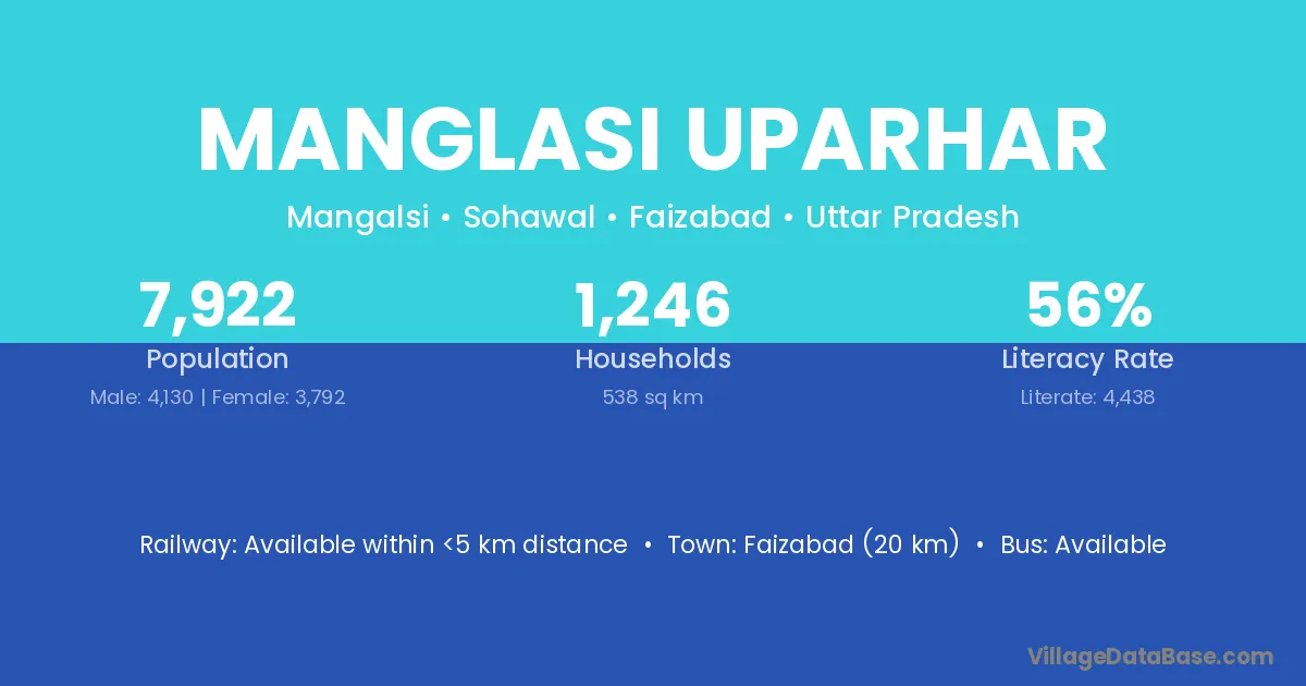 Faizabad (20 km) is the nearest town to Manglasi Uparhar village for major economic activities and is located approximately 20 km away.