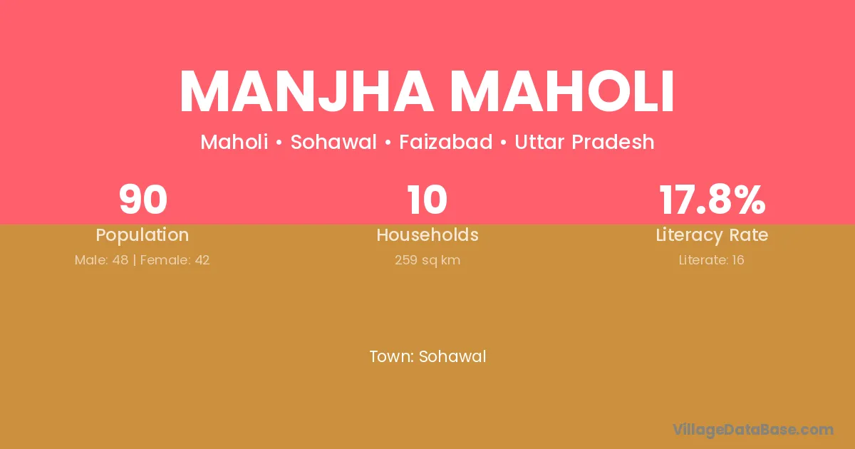 Manjha Maholi village has a total population of 90 people, of which 48 are males and 42 are females.