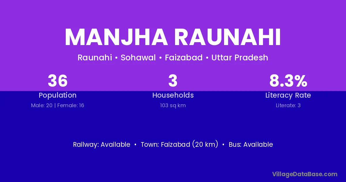 Faizabad (20 km) is the nearest town to Manjha Raunahi village for major economic activities and is located approximately 20 km away.