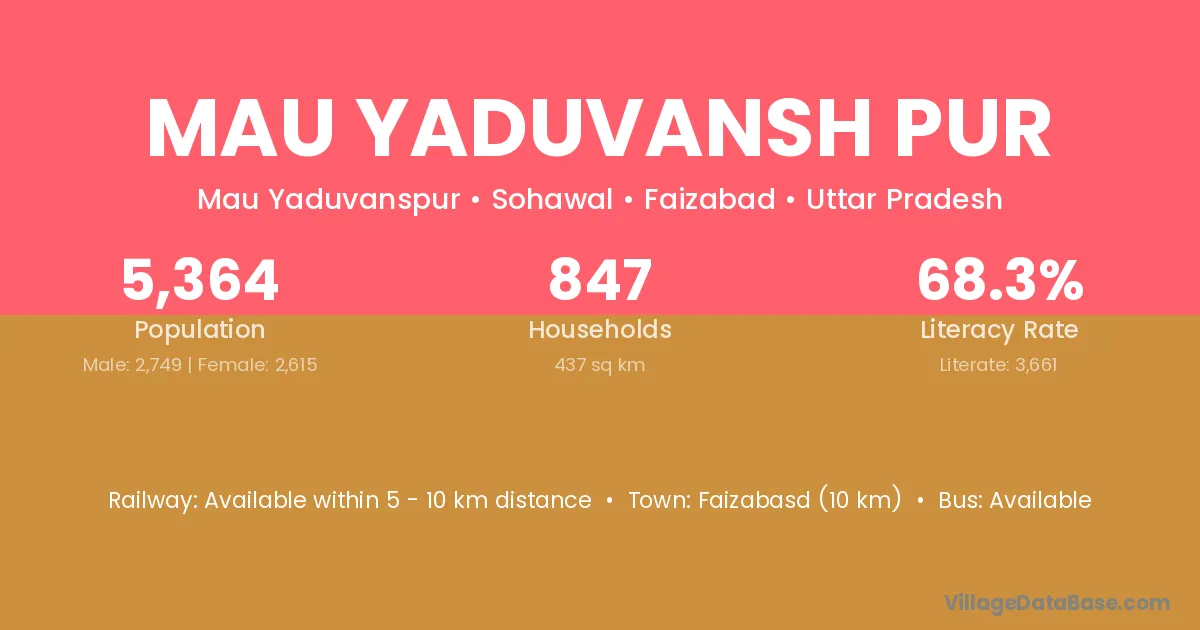 Mau Yaduvansh Pur village has a total population of 5,364 people, of which 2,749 are males and 2,615 are females.