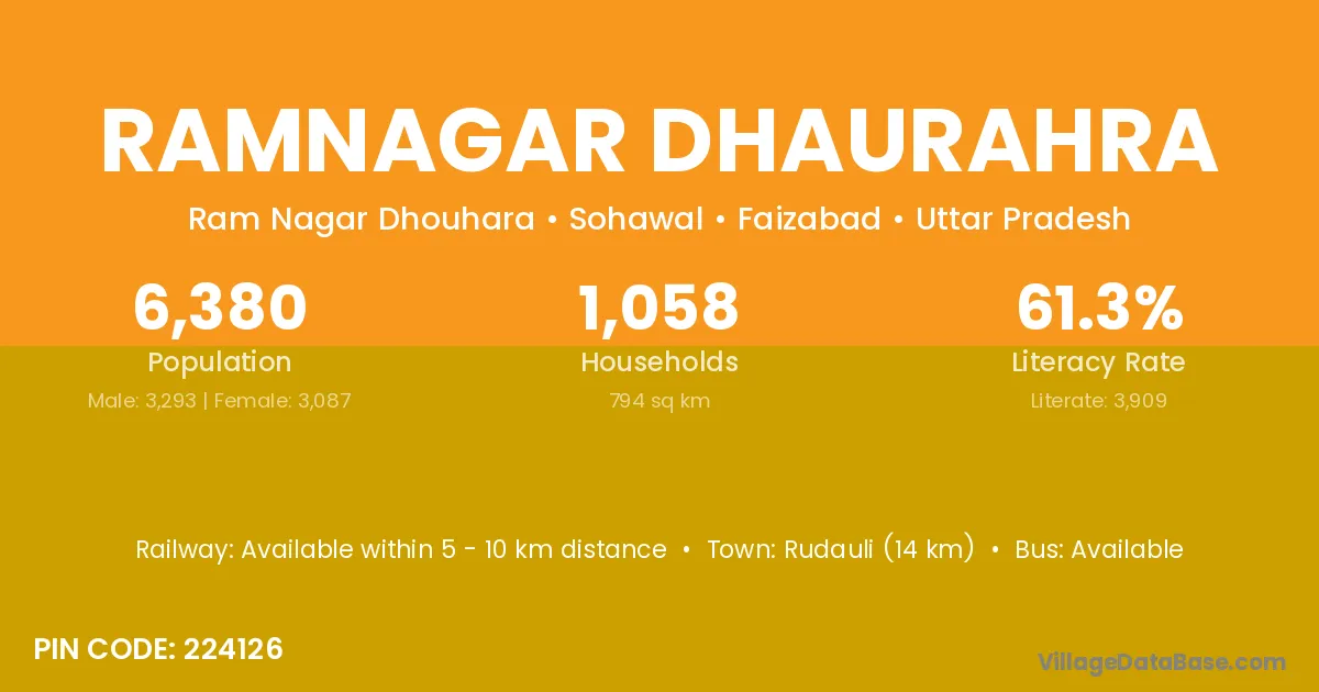 Rudauli (14 km) is the nearest town to Ramnagar Dhaurahra village for major economic activities and is located approximately 14 km away.