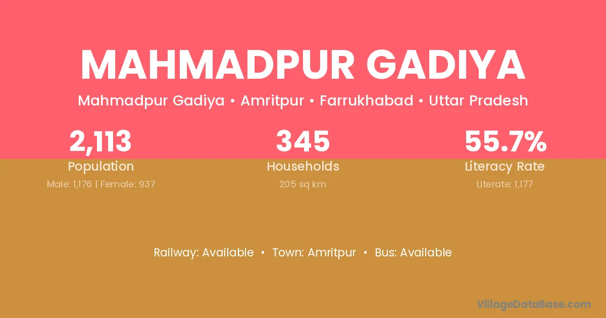 Mahmadpur Gadiya village has a total population of 2,113 people, of which 1,176 are males and 937 are females.