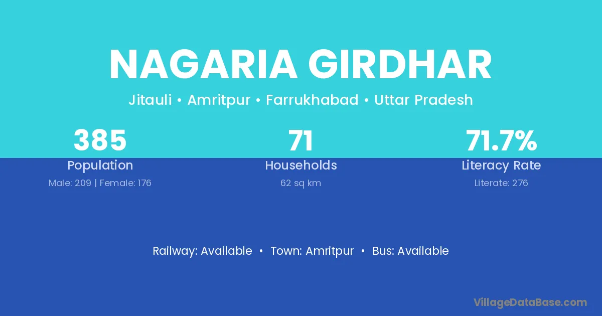 Nagaria Girdhar village has a total population of 385 people, of which 209 are males and 176 are females.