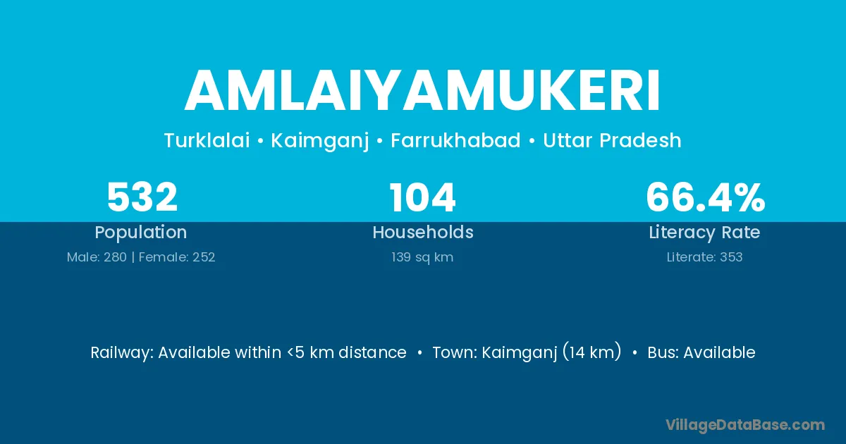 Amlaiyamukeri village has a total population of 532 people, of which 280 are males and 252 are females.