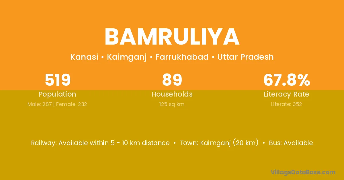 Kaimganj (20 km) is the nearest town to Bamruliya village for major economic activities and is located approximately 20 km away.