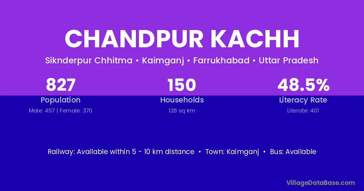 Chandpur Kachh village has a total population of 827 people, of which 457 are males and 370 are females.
