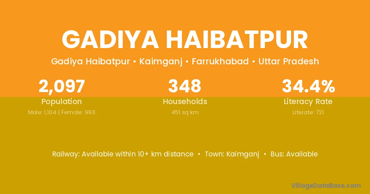Gadiya Haibatpur village has a total population of 2,097 people, of which 1,104 are males and 993 are females.